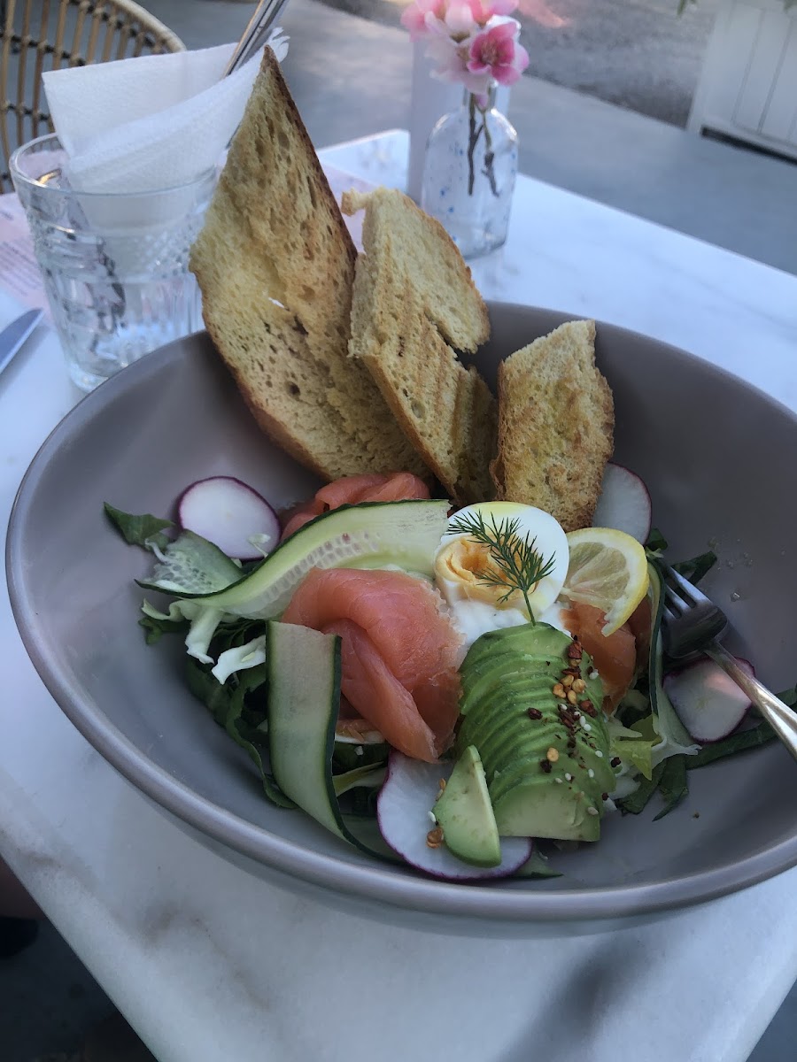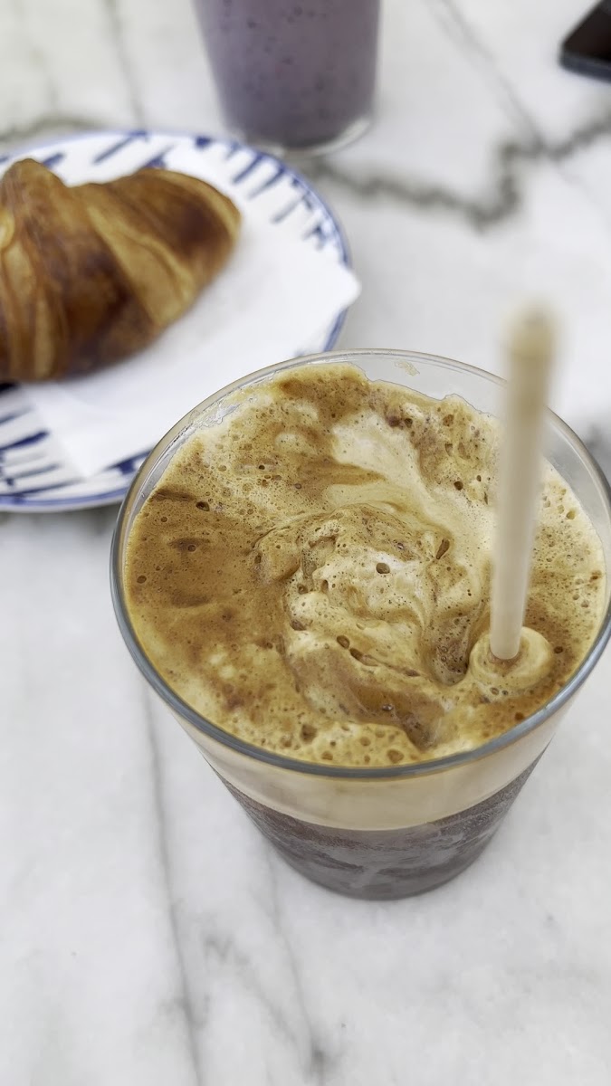 Beautiful lil spot, not too busy. Sat on roof, cool under the fans, and had a gorgeous Freddo Cappuccino (iced coffee) with oat milk. And an amazing breakfast. Lovely staff.