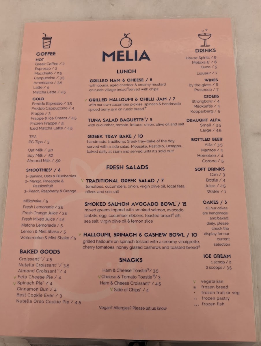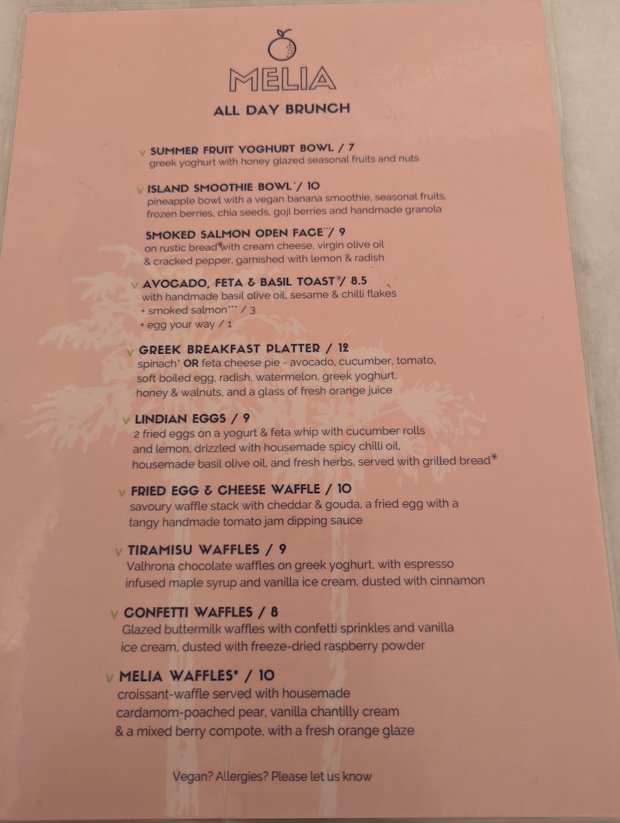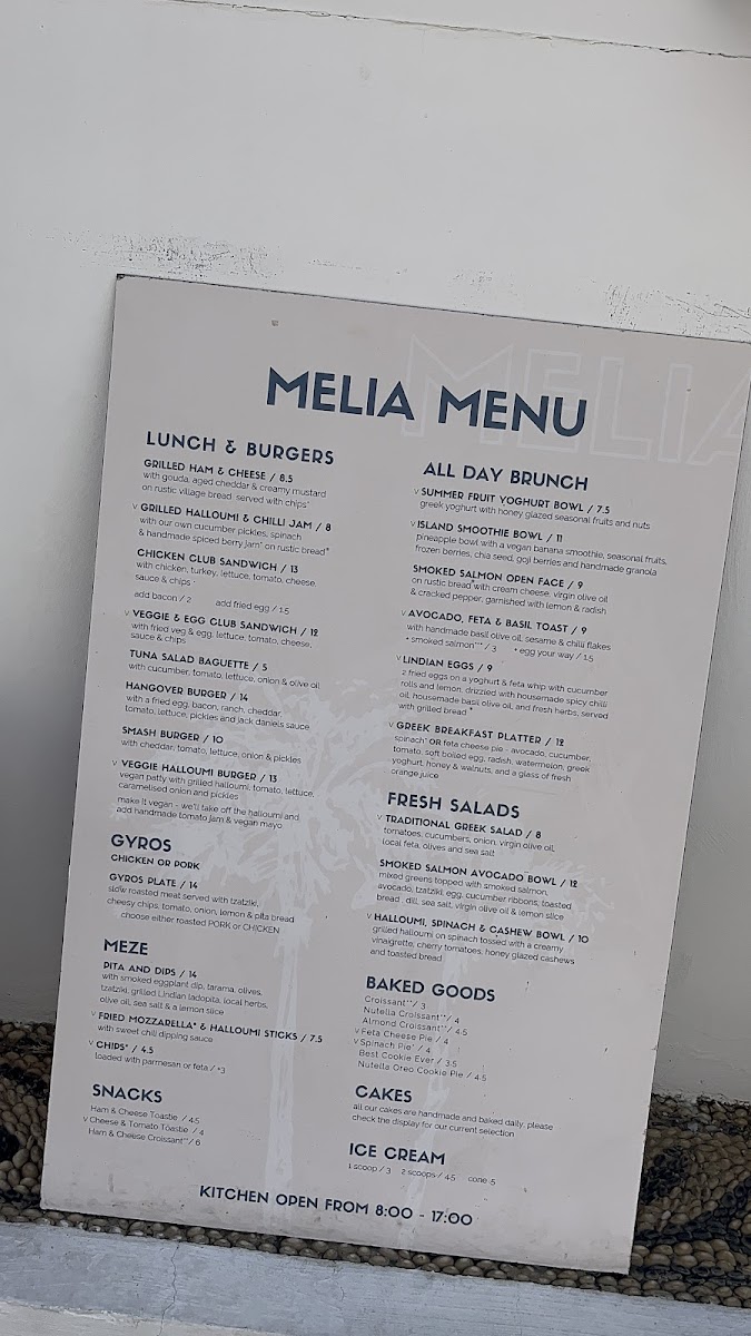 Melia’s menu offers a relaxed and inviting selection that suits a leisurely cafe experience. It features simple, wholesome dishes and refreshing drinks that complement the serene surroundings of Lindos. Whether visiting for a light breakfast, a midday break, or an afternoon refreshment, the menu is designed to be approachable and satisfying without fuss.